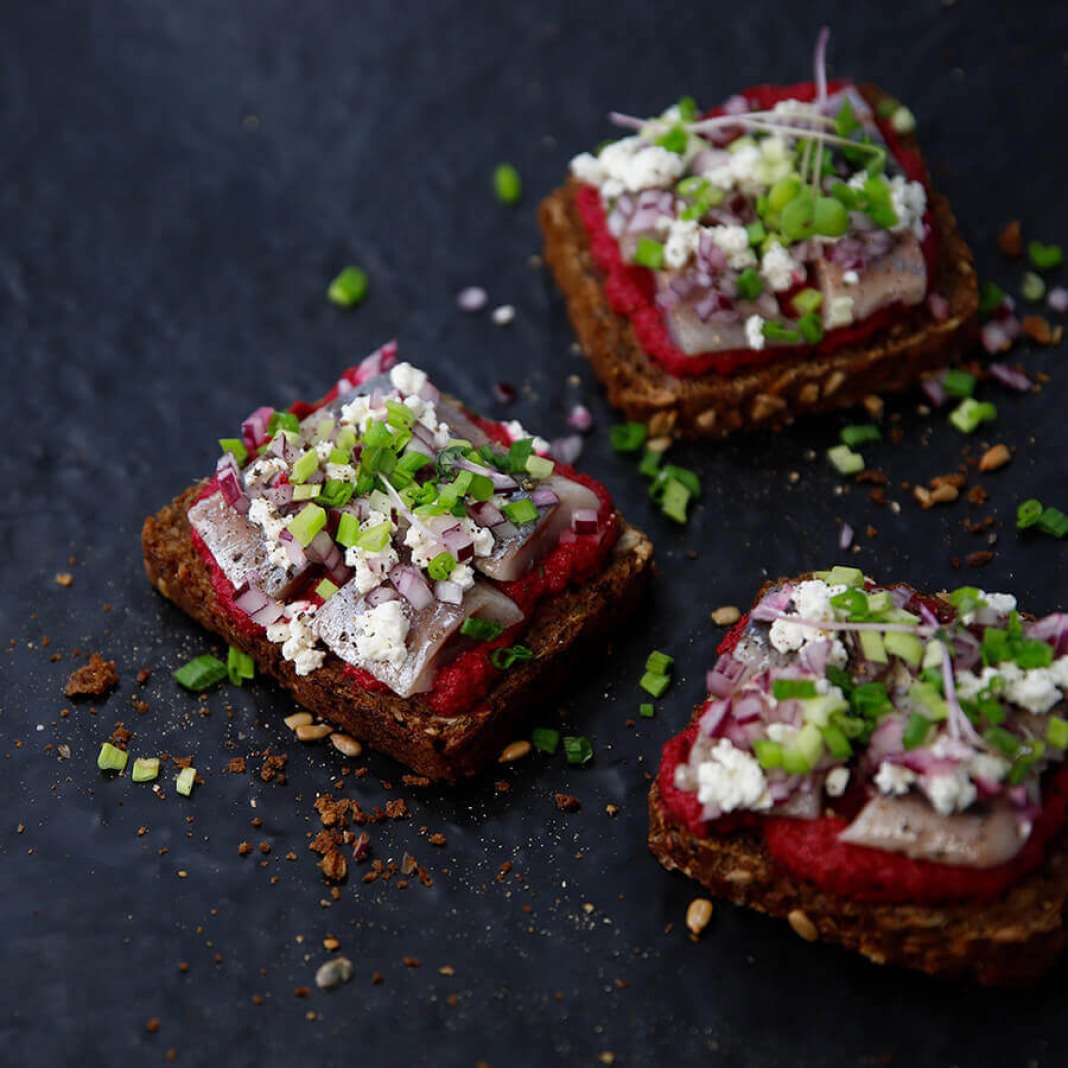 Matjes silkės sumuštinis su burokėliais ir grūdėta varške
