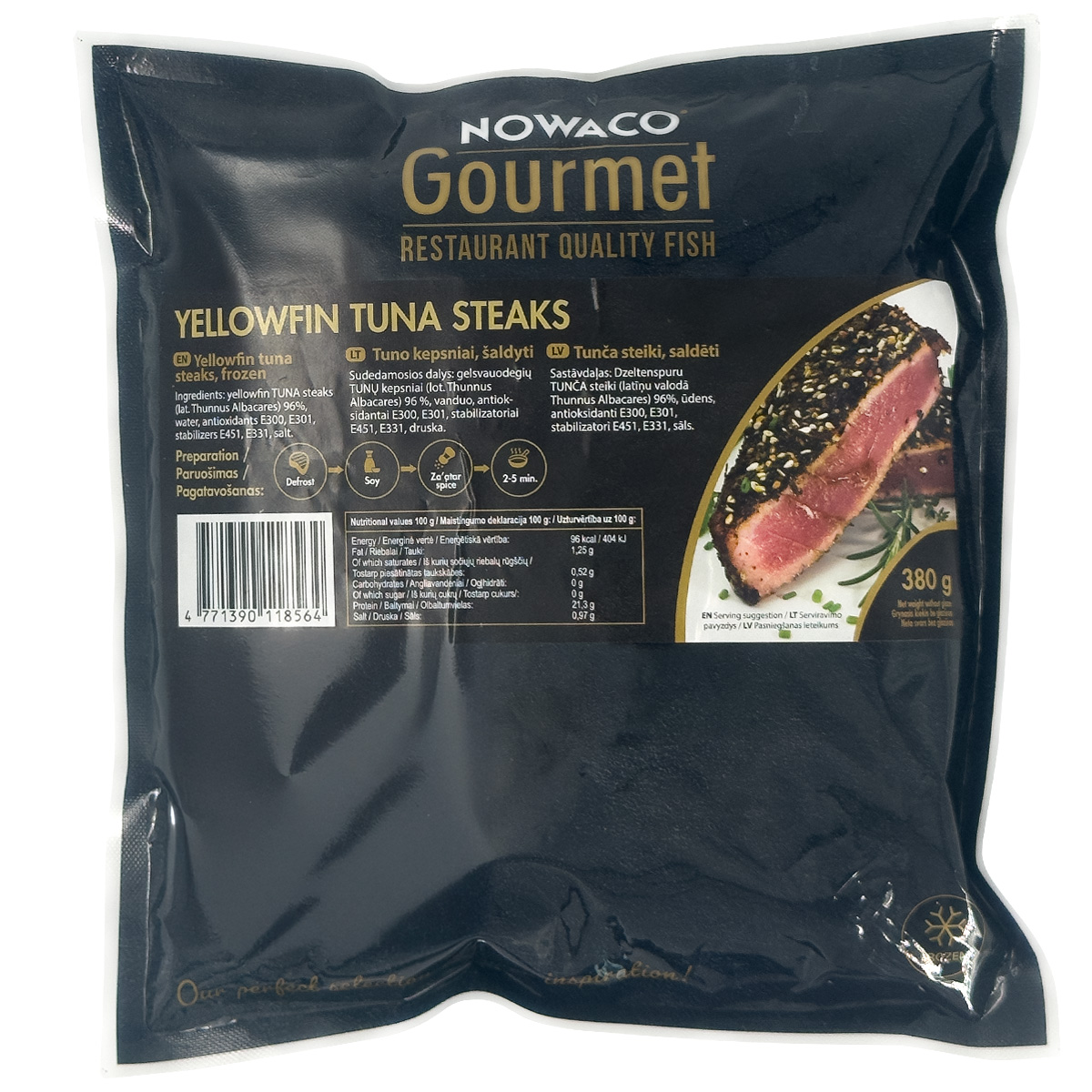 Sudedamosios dalys (alergenai): Gelsvauodegių TUNŲ kepsniai (lot. Thunnus Albacares) 96%