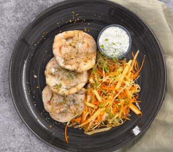 Argentininių lydekų filė kepsneliai su šviežiomis kopūstų ir morkų salotomis bei jogurtiniu padažu