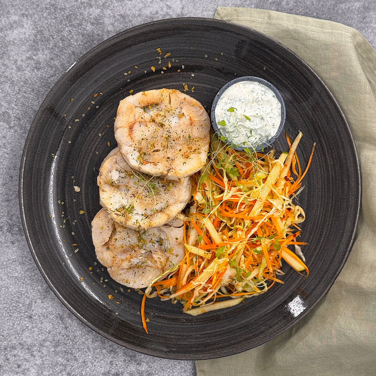 Argentininių lydekų filė kepsneliai su šviežiomis kopūstų ir morkų salotomis bei jogurtiniu padažu